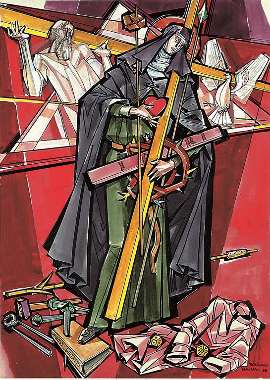 Una grande mistica ha illuminato con il suo splendore spirituale gli inizi della storia agostiniana: un’esperienza spirituale particolare e affascinante. Chiara, nata a Montefalco, già a sei anni d’età sentì la chiamata ad una vita di dedizione a Dio. Mostrando una maturità umana e spirituale fuori del comune, entrò nel reclusorio, costruito dal papà per la sorella maggiore, Giovanna, che stava conducendo vita contemplativa con alcune compagne. Nel 1290 il gruppetto di ragazze, compresa Chiara che assunse il nome di «Chiara della Croce», venne costituito giuridicamente in monastero, assumendo la Regola di S. Agostino. L’anno successivo, morta la sorella, Chiara venne eletta superiora, ufficio che conservò fino alla morte. Spiritualmente già matura, Chiara si sentì chiamata ad un'esperienza straordinaria; e dopo un lungo periodo di purificazione interiore arrivò all’unione mistica con il Cristo crocifisso. La sua vita ritirata non le impedì di svolgere un intenso apostolato di aiuto a coloro che si rivolgevano al monastero per qualunque necessità. Si interessò delle sorti della Chiesa, mettendosi in contatto con vescovi e cardinali. Consigliò e aiutò spiritualmente sacerdoti e religiosi. Smascherò e fece condannare, lei quasi analfabeta, le insidiose opinioni dei seguaci del «Libero Spirito». Dopo averla purificata con terribili prove interiori, il Signore legò a sé Chiara con i segni della passione. Negli ultimi tempi della sua vita era solita ripetere che Cristo ce l’aveva impresso nel cuore. Subito dopo la morte, avvenuta a 40 anni il 17 agosto 1308, le consorelle vollero provare il senso e il valore delle sue parole. Estratto il cuore vi trovarono impressi i segni della passione. Berengario, vicario generale della diocesi di Spoleto, incredulo e minaccioso, accorse subito a Montefalco per verificare di persona le “fantasticherie” che la gente diceva sul conto di Chiara e le “manipolazioni” perpetrate dalle monache. Ma di fronte all’evidenza si convertì in fervente ammiratore e divenne il primo biografo e animatore del processo per la sua canonizzazione, che venne fatto tra il 1318 e il 1319, con la deposizione di 486 testi. Solo nel 1881 però Chiara venne proclamata santa da Leone XIII. Sorella Chiara, anche se inimitabile nella sua esperienza personale, rimane affascinante: rappresenta l’innocenza che Dio ha raccolto prima che il fango della terra la deturpasse e corrompesse. Nella candida figura di Chiara noi ritroviamo l’amore puro e appassionato per il Signore, l’abbandono docile che permette a Dio di plasmare a suo piacere le creature, per farne cose straordinarie.