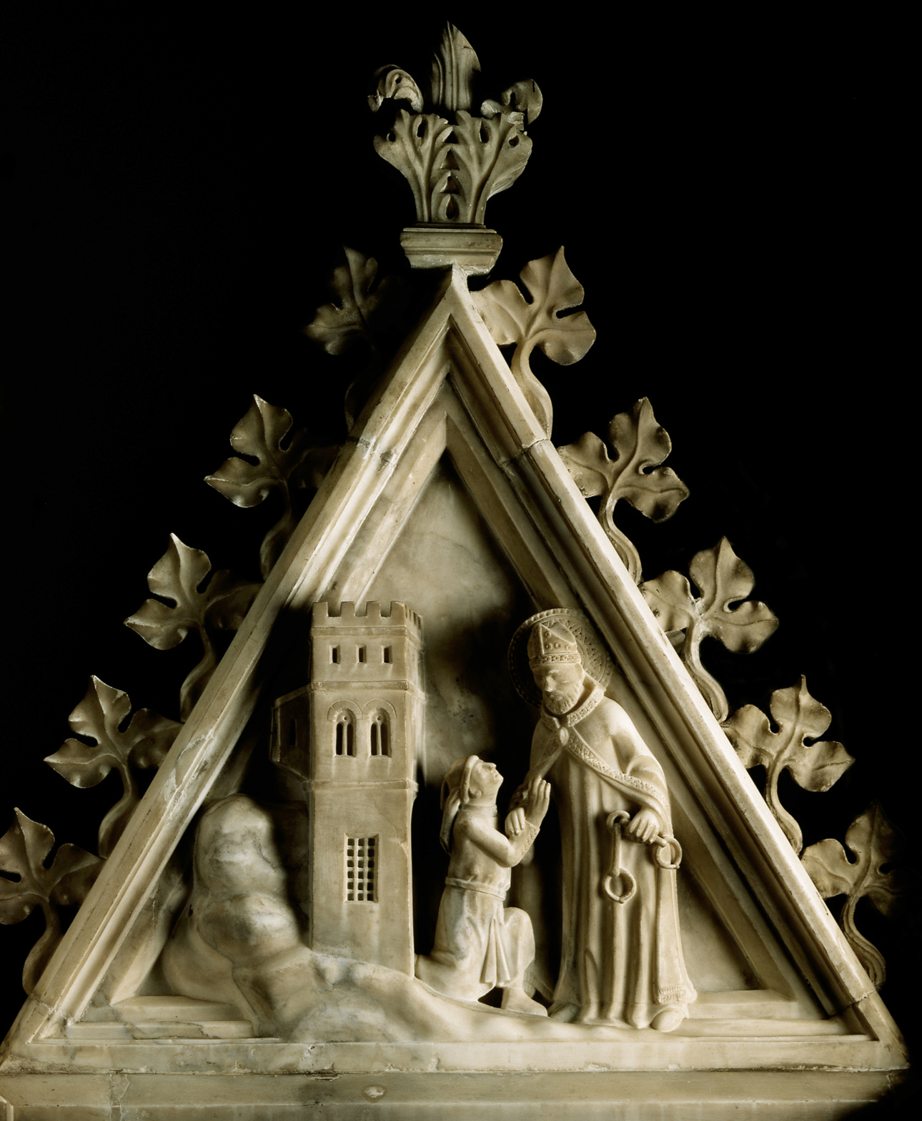 Nella fascia superiore è scolpita, in tre pannelli, la Conversione del Santo.